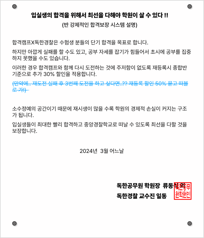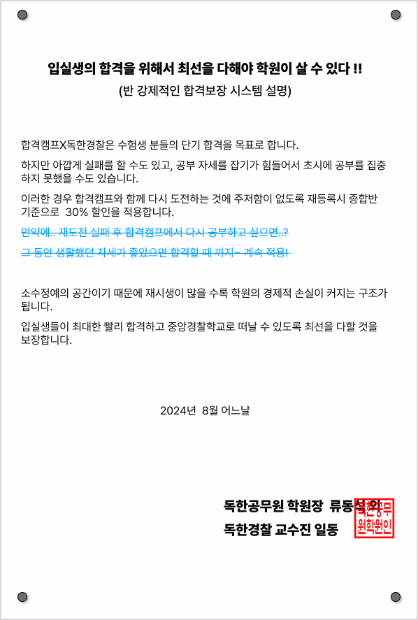 합격캠프 입실생 중 필기합격자는 독한경찰 원장님 직강으로 진행되는 100,000원 상당의 경찰 인성•적성검사 프로그램에 무료 참석 지원